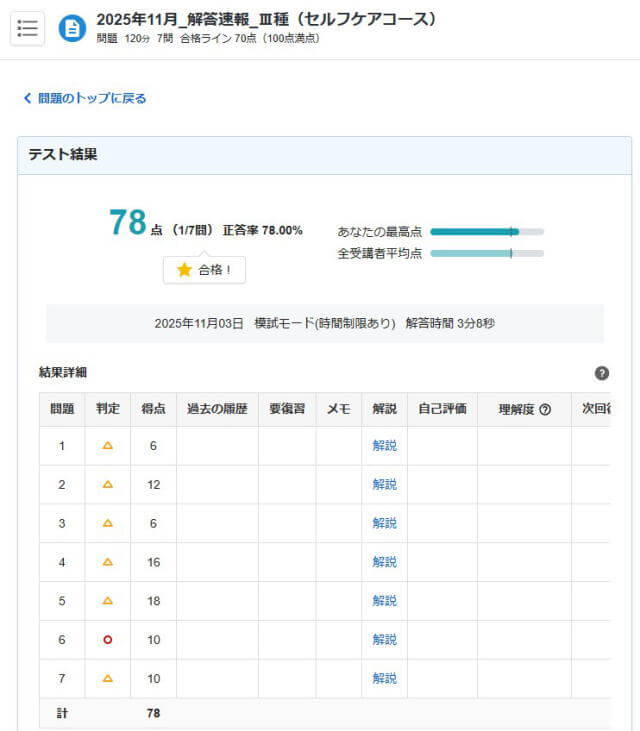 自己採点結果は78点とだいたい予想通りという感じですね。試験中につけた感触マークでは◎38個、〇7個だったので、80点台半ばくらいいってもおかしくはないなと密かに思ってはいたのですが全然伸びなかったです。